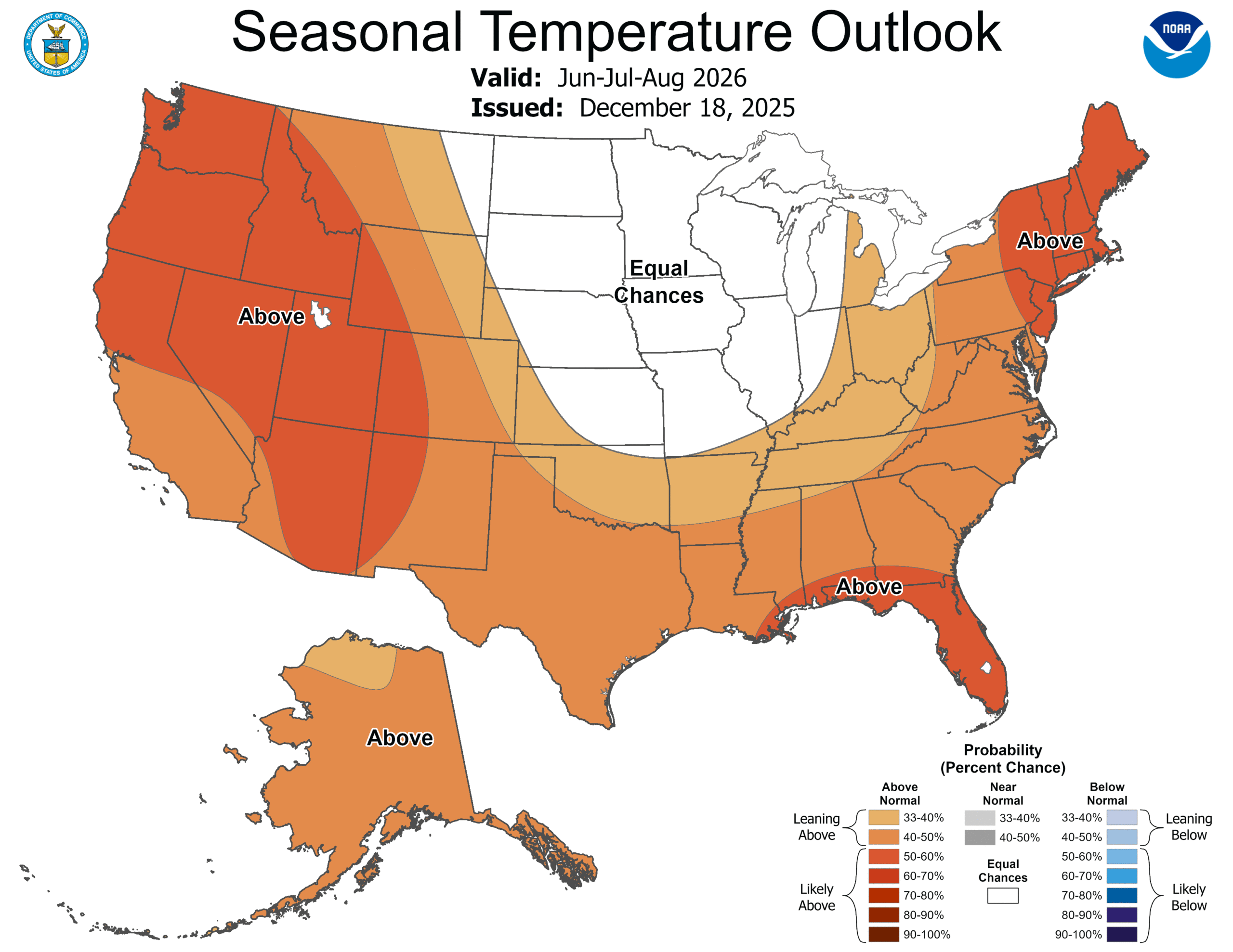 Finally, the meteorological summer 2026 season is likely hotter than normal across most of the U.S. except the Midwest States (Fig. 8). The Southeast and East Coast are likely wet zones while the Northwest is drier than normal (Fig. 9).