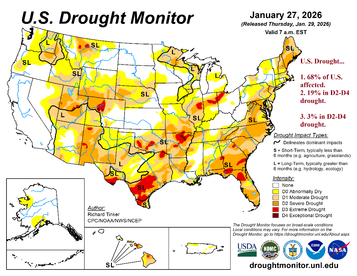 Fig. 1: The U.S. Drought Monitor reveals about 68% of the U.S. is affected by dry-to-drought conditions.