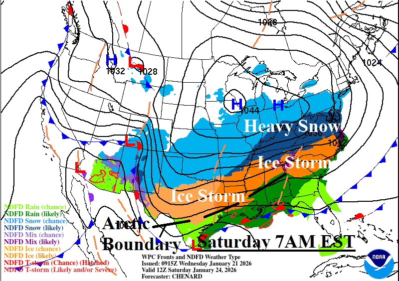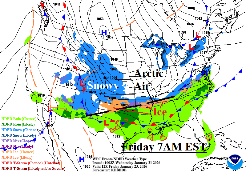 Discussion: Arctic air plows through the Great Plains quickly Thursday night reaching the southern Great Plains by dawn Friday (Fig. 1). At that time, a strip of freezing rain and icing develops along the arctic air boundary. The icing area gradually expands Friday/Friday night stretching from central/northern Texas to The Carolinas by Saturday morning (Fig. 2). Significant accreting ice is occurring causing power outages and major travel difficulties. The snow area expands rapidly eastward and by Friday night heavy snow is blanketing the Tennessee Valley eastward to the Mid-Atlantic States. Snowfall occurs with enough wind to cause blowing and drifting which makes travel difficult. By Saturday morning, the arctic boundary is just northwest of Houston. On Saturday, the icing continues while edging southward into the Houston area and maintaining intensity from Arkansas to the Carolinas. Ice accretion in the 0.5 to 1.0 in. range is possible which will cause widespread power outages. Heavy snow continues Sunday morning (Fig. 3) in the Mid-Atlantic region stretching north to southern New England. Very cold temperatures reach the northwest Gulf Sunday morning as the storm shifts eastward. Snow lingers on the Northeast Coast Monday. NBM forecasts storm snowfall total at 18-21 inches across Virginia to New Jersey with 10-15 inches possible southeast Massachusetts (Fig. 4). A foot or more of snow is expected across a large part of the eastern Tennessee Valley. Arkansas to Oklahoma receives close to a foot of snow. Of course, the deep snow cover allows incoming cold to reach the Gulf Coast (more) effectively, particularly the northwest Gulf Coast. The greatest hazard is ice accretion which is forecast to reach 0.25 to 0.50 inches from central Texas to the Carolinas with high spots possibly exceeding 1.0 inches (Fig. 5). The threshold for most to total loss of power is usually around 0.5 inches of ice. Arctic cold intensity increases especially once the accreting ice ends. The U.S. gas population weight HDD forecast indicates the coldest last week of January this century and is followed by a colder revision for early February. Of note, the extremely negative arctic oscillation (-AO) driving the cold weather historically lingers in February.