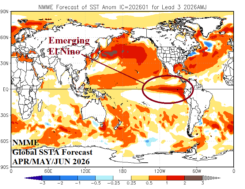 Discussion: Upper ocean heat east of the Dateline in the equatorial East Pacific is steadily increasing. The warming is attributed to an eastward shifting Kelvin Wave which has increased intensity during January (Fig. 1). The upper ocean heat warming is similar with 2023 ahead of an El Nino event that developed later that year. Global SSTA forecasts have adjusted to the evolving El Nino scenario for quarter 2 of 2026. Included is the International Multi-model Ensemble (IMME), ECMWF, NCEP CFS V2, and National Multi-model Ensemble (NMME). IMME and ECMWF are similar with moderate El Nino (Fig. 2-3) while CFS V2 and NMME are slightly less aggressive (Fig. 4-5). Of course, the forecasts indicated are made as the ENSO springtime prediction barrier approaches. However, the Kelvin Wave in the East Pacific subsurface substantiates the warmer SSTA forecasts by 4 global SSTA models. Climate Impact Company will re-issue month 1-4/season 1-4 ahead climate forecasts this week identifying the changing ENSO influence.