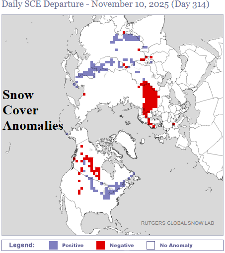 Discussion: Northern hemisphere snow cover as of November 10, 2025, has expanded across all of Russia (except southwest) and most of Canada. Snow cover is ahead of schedule Interior Northeast U.S., along the Northern China border, and West China. Snow cover will bias the local climate cold. Below normal snow cover is vividly present across Northeast Europe and Northwest Russia biasing the climate pattern warm although snow and cold is ahead for this zone.