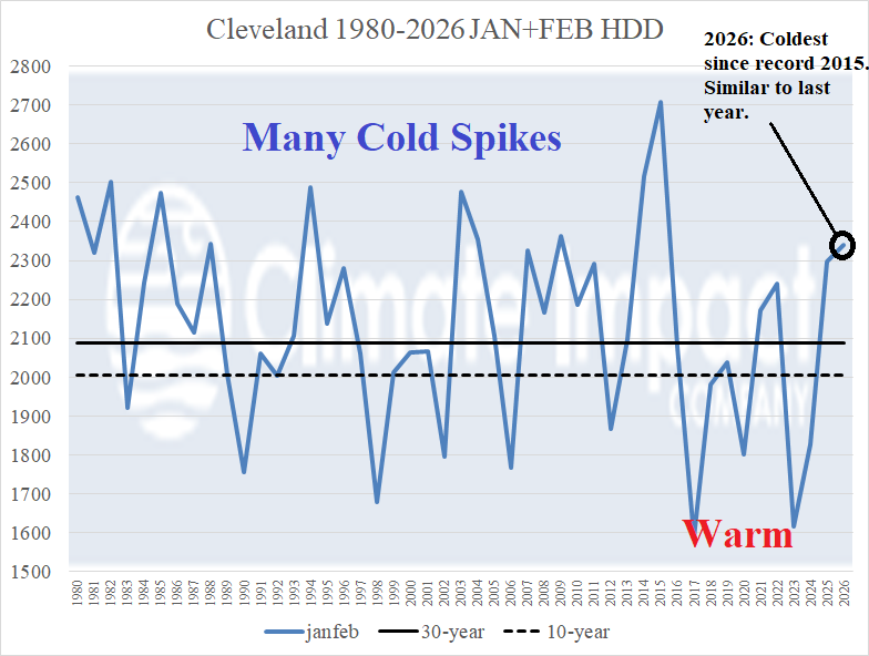 Discussion: The observed heating degree days (HDD) in Cleveland during JAN-26 is 1335, much colder than the 30-year (1123) and 10-year (1082) normal. The JAN-26 cold is slightly colder than JAN-25 (1277) and JAN-22 (1273). The JAN-26 observation is 1 HDD colder than the “polar vortex winter” of JAN-14 (1334). Prior to JAN-14, there are 8 colder January’s dating back to 1980. The Climate Impact Company HDD projection for FEB-26 in Cleveland is slightly colder than normal (1004 forecast vs. 30-year normal [966] and 10-year normal [924]). The JAN/FEB 2026 HDD (2339) is the coldest since JAN/FEB 2015 (2709). Since 2015, most JAN/FEB combinations are warmer than normal in Cleveland (Fig. 1). In this decade, either cold or warm extremes have been observed.