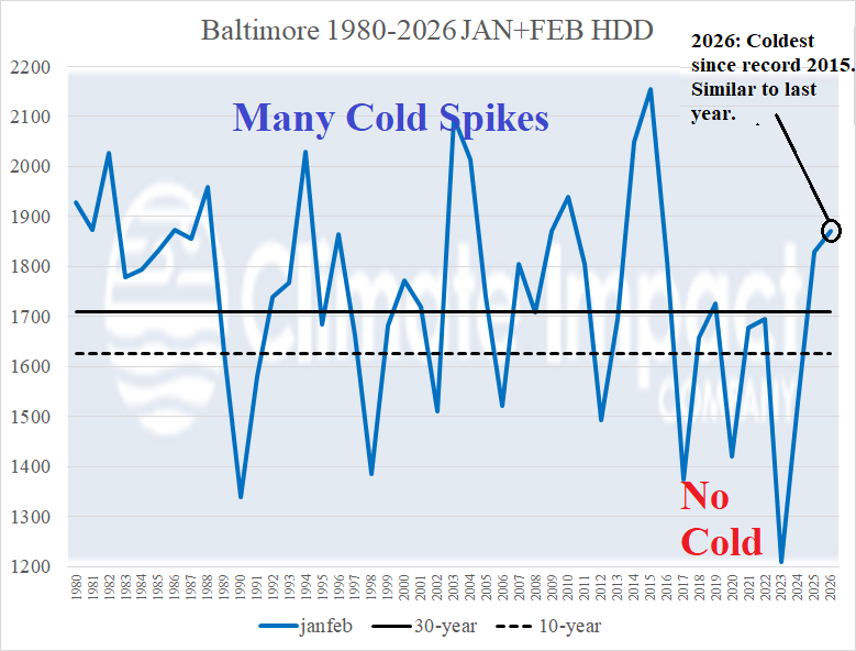 In Baltimore, the JAN-26 HDD was 1059 and much colder than the 30-year (930) and 10-year normal (898). Last year was colder (1069) and JAN-25/JAN-26 are the coldest since JAN-14 (1157). JAN-15 observed 1052 HDD. JAN-26 is the 13th coldest (for January) since 1980. The Climate Impact Company HDD projection for FEB-26 is 812 HDD colder than the 30-year (779) and 10-year (728) normal. The JAN/FEB 2026 HDD (1871) is the coldest since JAN-15 (2154) and JAN-14 (2049). Since 2014-15, most JAN/FEB are near to much warmer than normal until the past 2 years (Fig. 2).