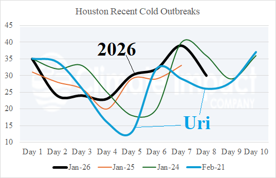 In Houston, the JAN-26 cold wave was 8 days long featuring cold peaks of 23 on Jan. 27th and 24 on Jan. 25-26th. The JAN-26 event is very similar in duration and intensity to the JAN-25 cold outbreak (Fig. 3). However, the JAN-26 event was not as intense as Winter Storm “Uri” observed in FEB-21.