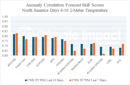 Fig. 1: North America 2-meter temperature anomaly correlation forecast skill scores from the past 30 and 7 days for the 6-10-day period.