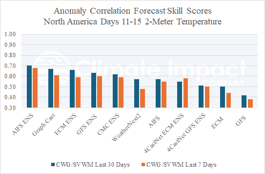 Fig. 2: North America 2-meter temperature anomaly correlation forecast skill scores from the past 30 and 7 days for the 11-15-day period.