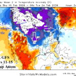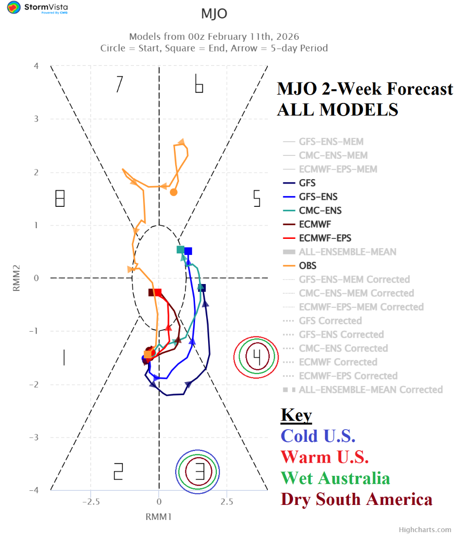 Fig. 1: The 2-week Madden Julian oscillation forecast utilizing all operational models indicates a moderate-strength phase_3 through the middle third of February followed by a weaker phase_4.