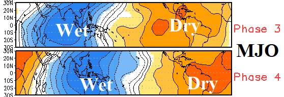 Fig. 2: The MJO influence on vertical motion acting as the catalyst to rainfall in the tropics for phase_3 and phase_4.