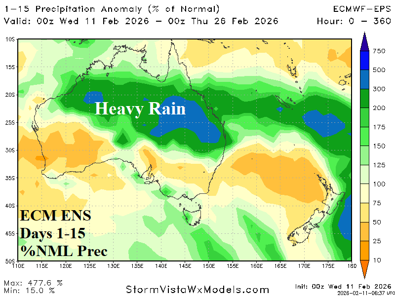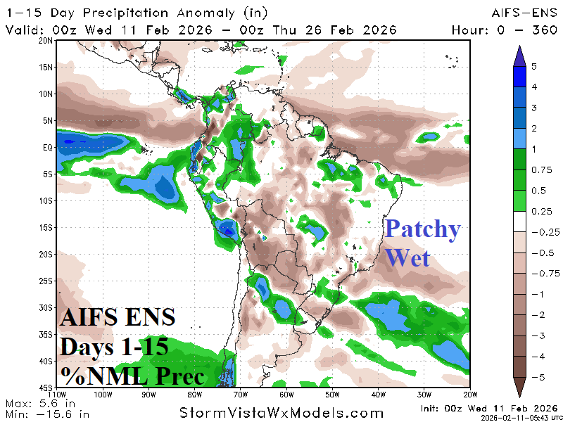 The MJO phase_3 to phase_4 transition supports a wetter climate for Australia and drier regime in South America (Fig. 2). The 15-day operational forecast indicates prohibitive rains in Australia (Fig. 3) while the rainfall pattern in South America is patchy (Fig. 4).