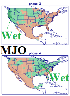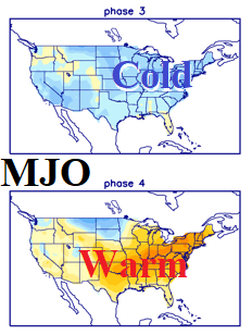 In the U.S., the MJO phase_3 favors a colder regime (Fig. 5) for the U.S. which is in the face of very warm operational forecasts. Once MJO reaches phase_6, the influence on the U.S. is generally warm. MJO phase_3 favors West U.S. storminess shifting to the Midwest States during phase_4 (Fig. 6).