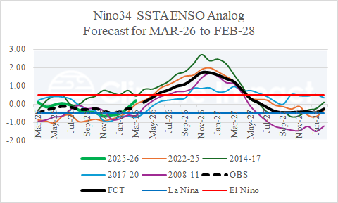 Fig. 2: The Climate Impact Company constructed analog forecast of ENSO phase for MAR-26 to FEB-28 utilizing the Nino34 SSTA.