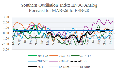 Fig. 3: The Climate Impact Company constructed analog forecast of ENSO phase for MAR-26 to FEB-28 utilizing southern oscillation index.