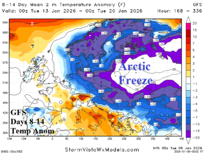 The GFS 1-7-day forecast indicates expansive cold to very cold weather enhanced by widespread above normal snow cover. Both GFS and ECM agree that arctic air becomes involved in the 8-14-day period adhering to East Europe and West Russia. Snow cover is above normal as indicated by GFS for midday today and increases/deepens over the next 2 weeks.