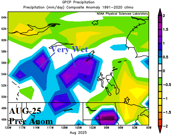 Canadian Duram crop samples show damage by wet weather according to a Reuters report issued yesterday. The damage is likely related to a dry start to summer ending very wet in August. The JUN/JUL/AUG 2025 precipitation anomalies are misleading indicating widespread dryness while the southern prairies were soaking wet in August.