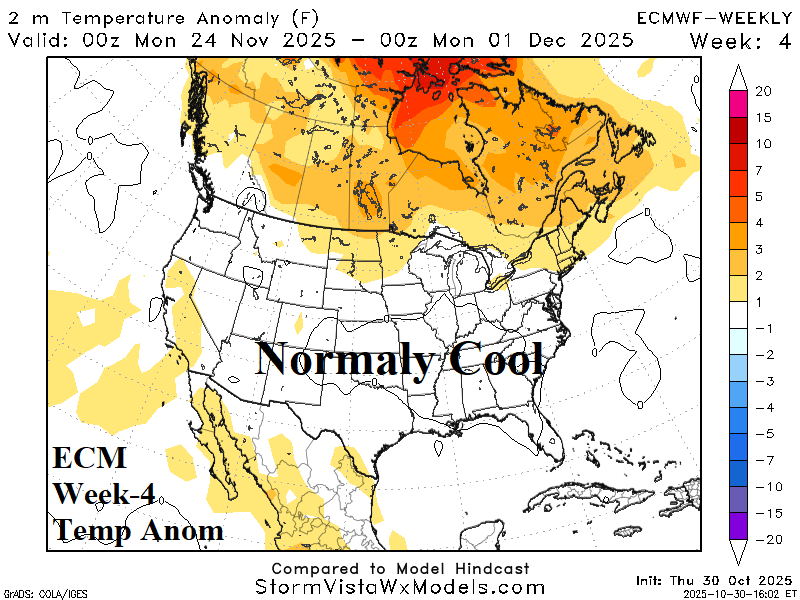 The North America snow cover lagged below normal during mid-autumn thanks to a warm Canadian climate while advection snows across the open water north of Eurasia during October allowed snow cover to build above normal during mid-autumn for the 15th straight year.