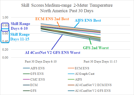 Discussion: During the past 30 days, 2-meter temperature forecasts across North America in the 6-10-day and 11-15-day period are best performed by AIFS ENS (Fig. 1). Second best is ECM ENS. Each model has routinely finished No. 1 and No. 2 for the second half of 2025. The changeable GFS ranked next to last for the medium range while (surprisingly) AI 4Cast Net V2 GFS ENS was consistently last. Skill scores for days 1-5 are generally between 0.95 and 1.0. Therefore, reasonable is the assertion that 6-10-day outlooks are about 75% as good as short-range forecasts while 11-15-day projections are about 50% as good as short-range forecasts for North America entering the New Year. Of course, not factored in is the forecast difficulty of the weather pattern which was quite high in North America given the extreme East cold to start the month and the very warm finish. The convenient zero to one scale anomaly correlation skill score is used in this assessment.
