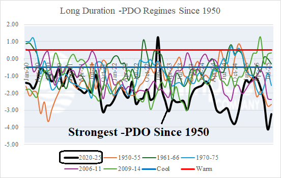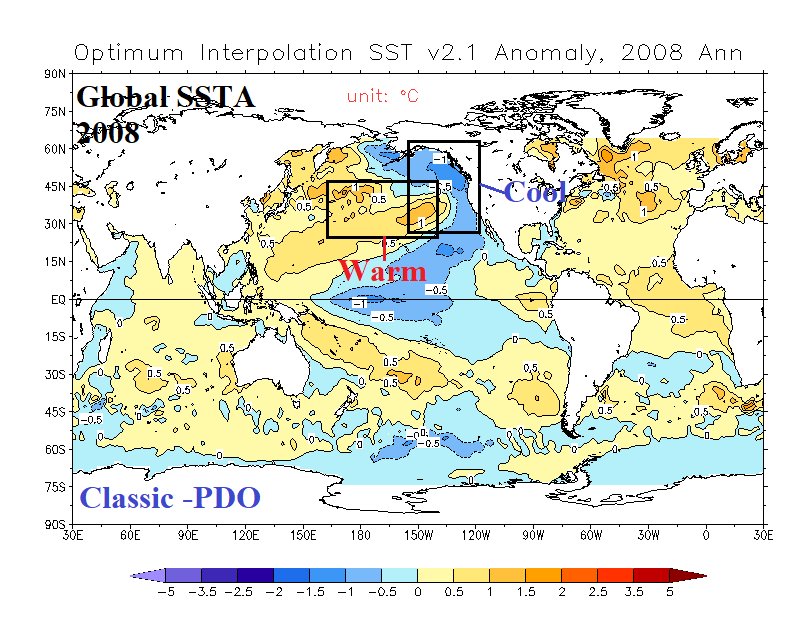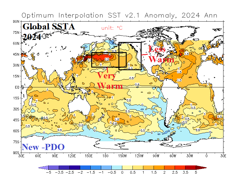 Fig. 1-4: The daily North Pacific SSTA analysis, long duration -PDO regimes since 1950, and classic and new -PDO regime comparisons.