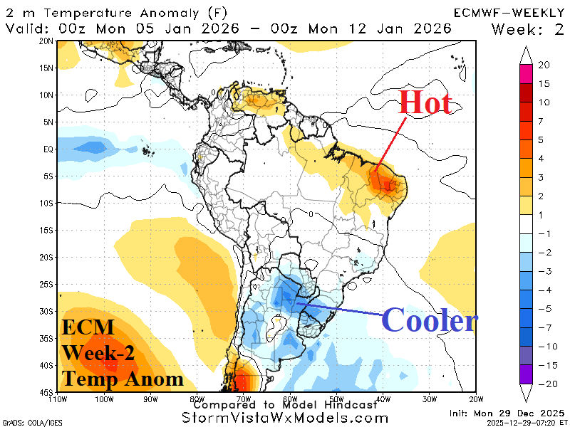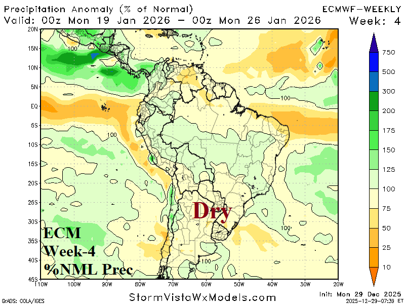 Week-2 Valid January 4-11, 2026: Lingering rain Argentina; Wetter East Brazil.