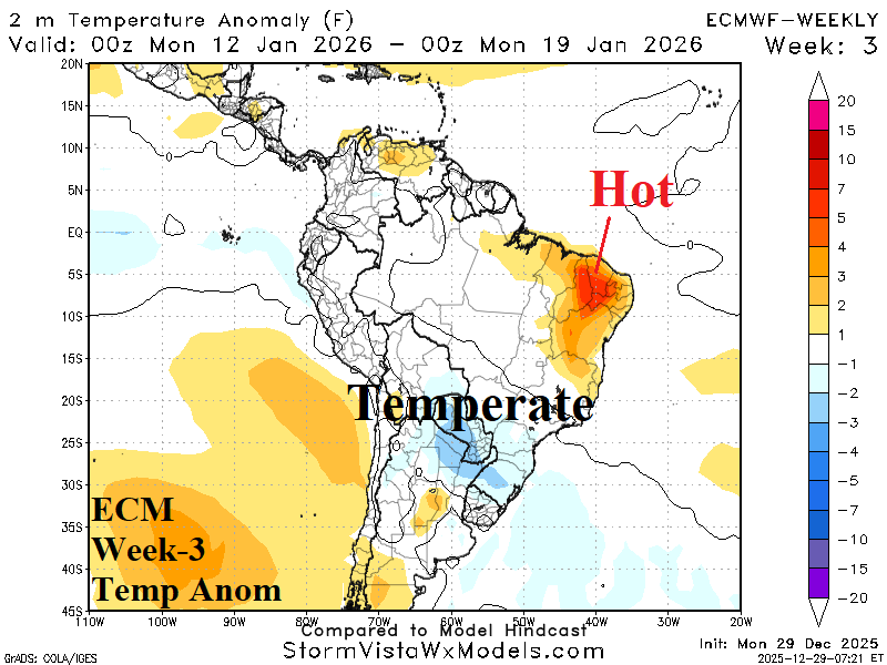 Discussion: Wet weather lingers in Argentina while much needed rain arrives in East Brazil. Northeast Brazil is the dry and hot zone.