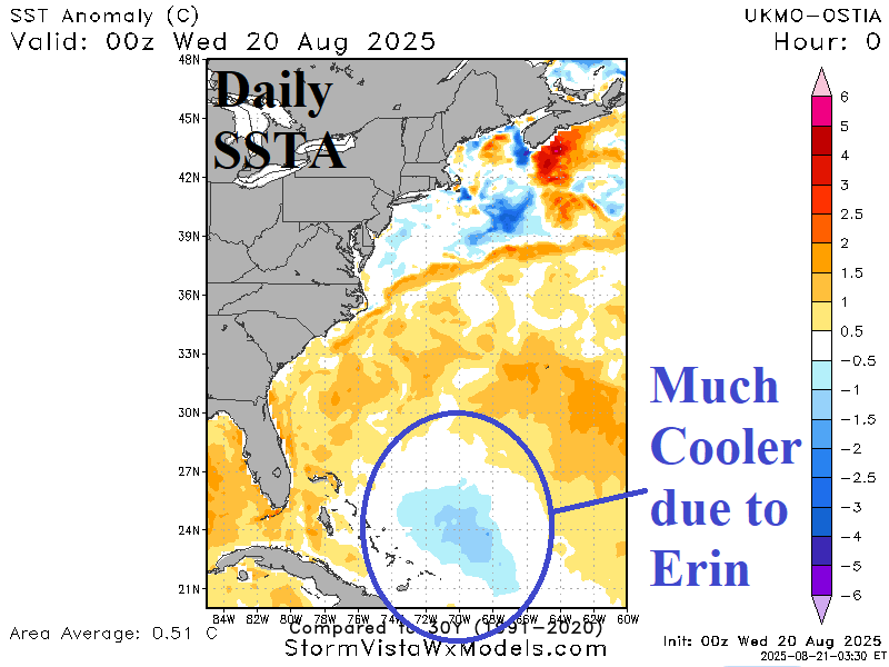 On a related note, Erin has significantly cooled the ocean surface east of the Bahamas (Fig. 5). SST in the core of the cooler zone are 80-81F, below the threshold to sustain a tropical cyclone. The 7-day SST change in near 2.5C due east of the Bahamas (Fig. 6). To the north of Puerto Rico, north of 25N, the SST are somewhat warmer than normal which explains the potential hurricane intensity of tropical cyclone models for 90L.