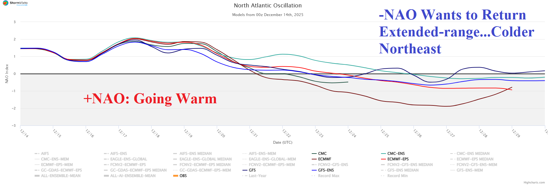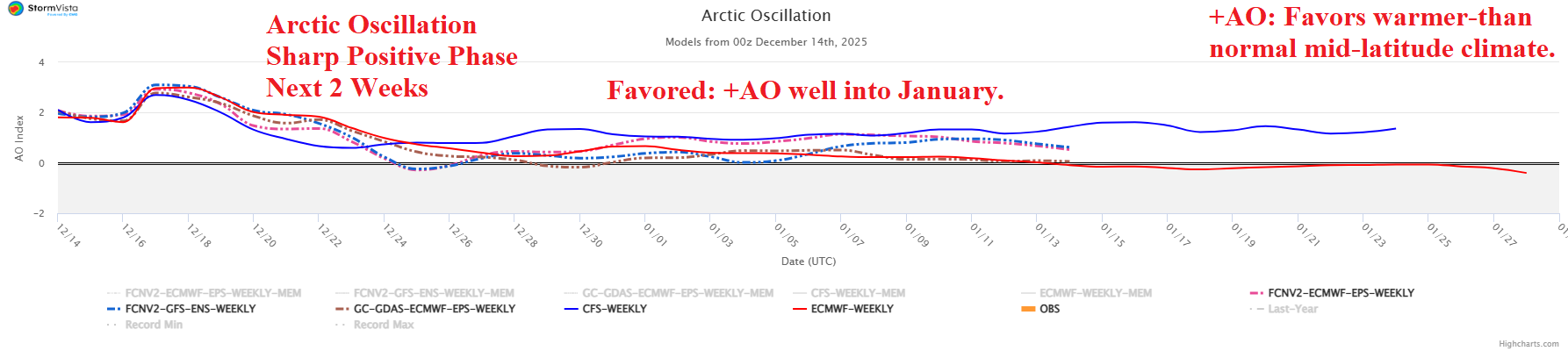 Discussion: An intense convection phase of the Madden Julian oscillation (+MJO) across Maritime Continent and the West Pacific tropics during November and early December (Fig. 1) contributed warming into the upper atmosphere and pole ward causing a stratosphere warming event (Fig. 2). However, the MJO is forecast to shift quieter during the second half of December. Consequently, stratospheric warming fades. The arctic oscillation (AO) which identifies the location of the polar vortex indicates a change to positive phase the next 1-2 weeks as the recent frigid Canadian polar vortex shifts poleward. The shift toward the North Pole allows milder Pacific maritime influence to warm the U.S. pattern. The extended-range AO forecast suggests the positive phase may continue well into January (Fig. 3). However, there are caveats. The New York/New England states are susceptible to regenerating cold due to proximity of snow cover which re-expands just after Christmas Day (Fig. 4). The prohibitive atmospheric river pattern should pile snow across the Northwest U.S. and possibly farther south to the Great Basin and certainly the Sierra Nevada and Rocky Mountains (Fig. 5). The West U.S. snow cover expansion suggests a colder regime vs. mild forecasts. The negative phase Pacific North America (-PNA) index supports the colder/stormy regime in the West continuing beyond 15 days (Fig. 6) while regenerating negative phase North Atlantic oscillation (-NAO) supports returning cold to the Northeast in the extended range (Fig. 7).