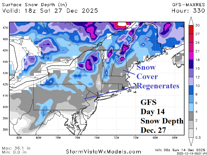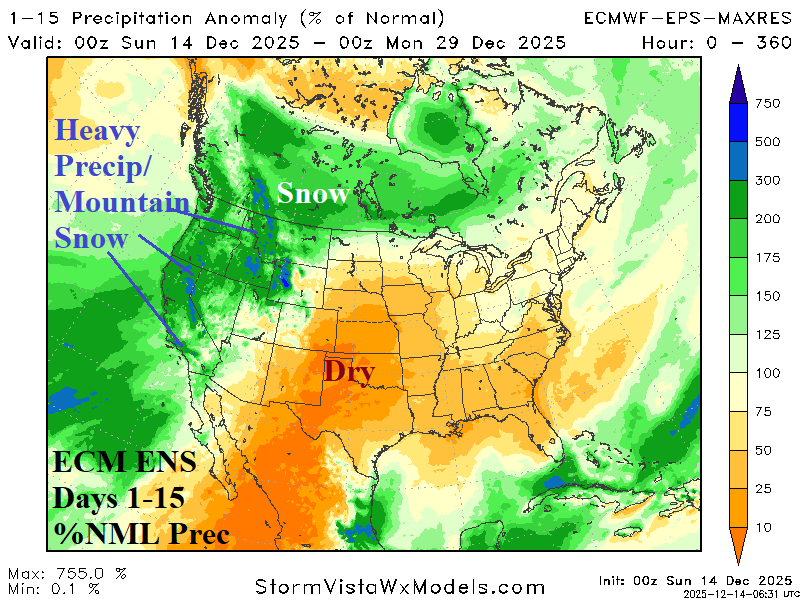 Fig. 4-5: Regenerating Northeast U.S. snow cover after Christmas Day and the 15-day prohibitive percent of normal precipitation forecast for the West U.S.