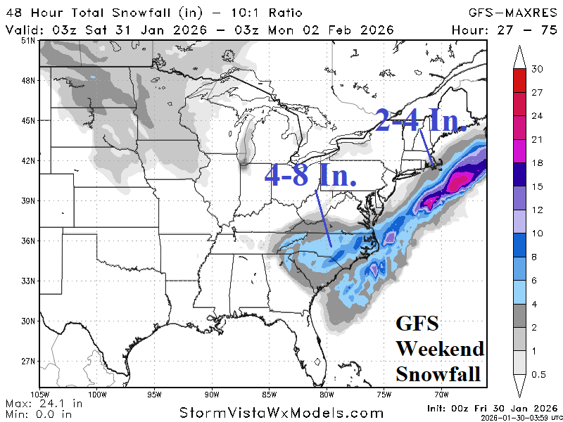 Discussion: The GFS was the first model to doubt significant Northeast Corridor coastal snowstorm this weekend. Overnight, GFS continues to push the bulk of the snow offshore especially in the Northeast (Fig. 1). A hefty 4-8 inches of snow remains in the forecast for the Carolinas while much of Virginia will miss the snow. While we’re in a -AO/-NAO climate pattern, inevitable is more snow events likely “Alberta Clipper” style in character. Another moderate snow event is forecast during middle of next week across the Ohio Valley/Northern Mid-Atlantic (Fig. 2) with a potential major New England snowfall event Feb. 6-8 (Fig. 3).