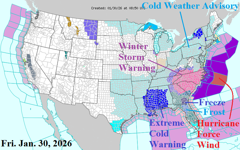 NOAA/NWS has issued a Hurricane Force Wind Warning off the North Carolina Coast, Storm Warning for the Mid-Atlantic Coast, and Gale Warning for the Northeast Coast (Fig. 6). A Winter Storm Warning covers the Carolinas and warnings, watches, and advisories extend across the South and East U.S. for the ongoing very cold weather.