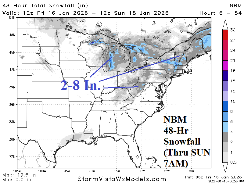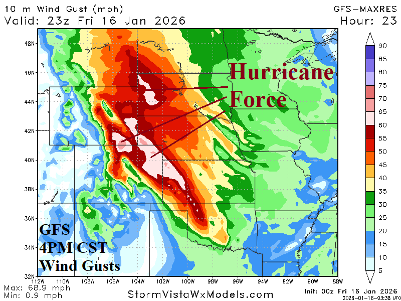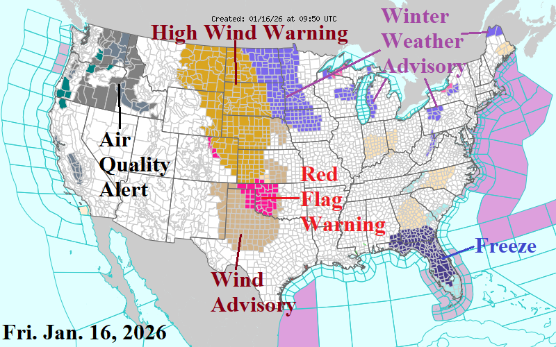 Discussion: A dangerous high wind event is forecast for today across the northwest and west Great Plains (Fig. 1). Wind advisories and a Red Flag Warning extend southward to West Texas. High wind gust forecasts in the warning area reach minimal hurricane force peaking mid-to-late afternoon today (Fig. 2). A Florida Freeze reaches southward across Florida citrus. A snowy pattern shifts across the Upper Midwest, Great Lakes, and Northeast U.S. into the weekend featuring a large swath of 2-8 inches of snow (Fig. 3). Regarding snow cover, the U.S. snow cover is below normal as mid-January arrives (Fig. 4-5). However, given the lengthy negative arctic oscillation (-AO) the remainder of January, inevitable is a southward expansion of snow cover. The GFS snow depth forecast indicates Arkansas to the Tennessee Valley is snow covered in 2 weeks (Fig. 6). Widening snow cover enables expansive cold risk peaking on the morning of Monday January 26 when Dallas dips to 31F, Atlanta is 28F, Washington is 20F, Boston is 14F, and Chicago reaches zero (Fig. 7).