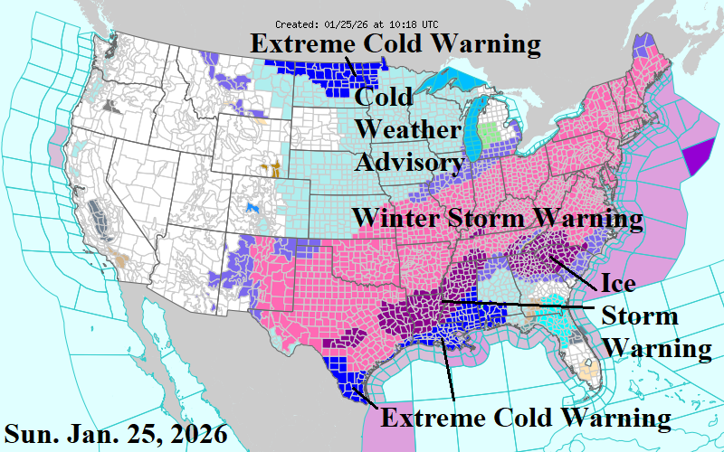 Winter Storm Warning’s are in effect from Texas to the East Coast from North Carolina to Maine (Fig. 1). An Ice Storm Warning is maintained in South-central Texas, East Texas, Louisiana, and Mississippi plus Georgia and South Carolina. An Extreme Cold Warning is issued for the west/north Gulf Coast.