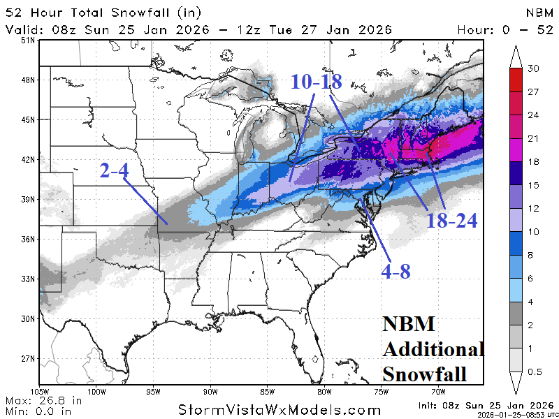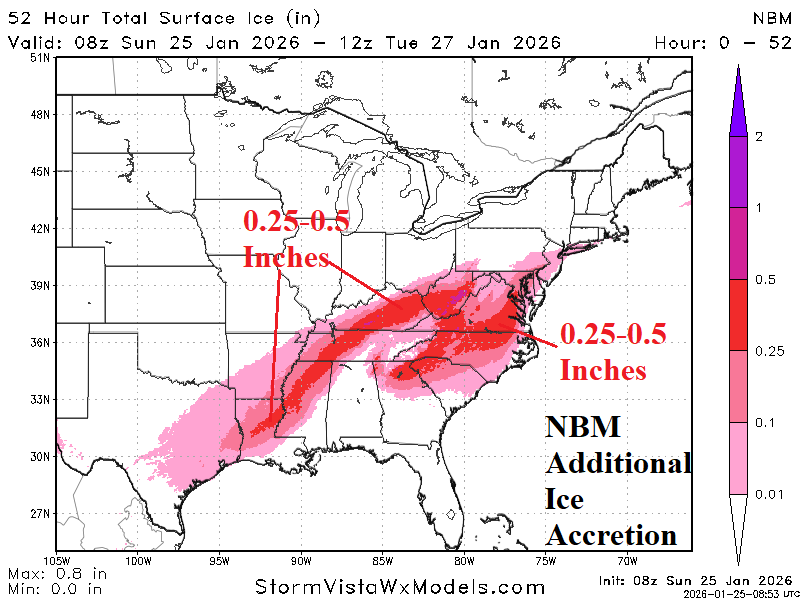 The latest NBM snowfall forecast indicates 18-24 inches of snow from Albany to Boston today and Monday (Fig. 2). 10-18 inches of snow extends from Ohio across Pennsylvania. Amounts are cut back Maryland and southward due to sleet and freezing rain. The core of major ice accretion stretches from Eastern Louisiana to Kentucky, the Southern Appalachians, and Raleigh to Richmond (Fig. 3).