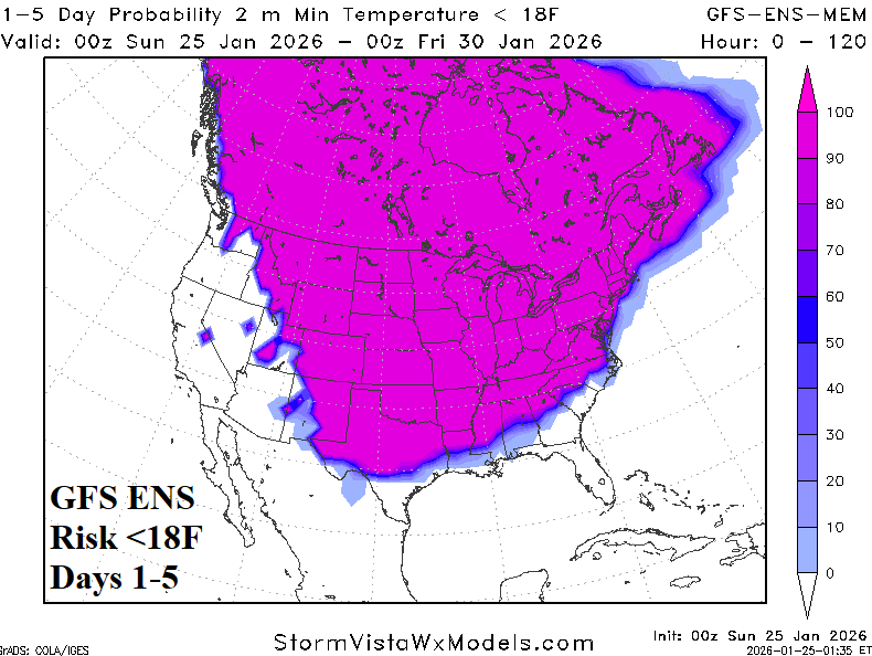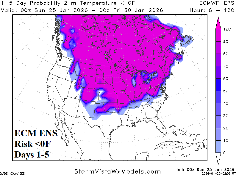 The following cold is impressive with <18F risk extending southward, almost to the Gulf Coast, and well into the Carolinas (Fig. 6). The <0F risk through the next 5 days extends southward to the southern Great Plains and eastward to near I-95 in the East (Fig. 7). The deep snow propels a long duration cold event across the eastern half of the U.S. as indicated by ECM (Fig. 8-9).