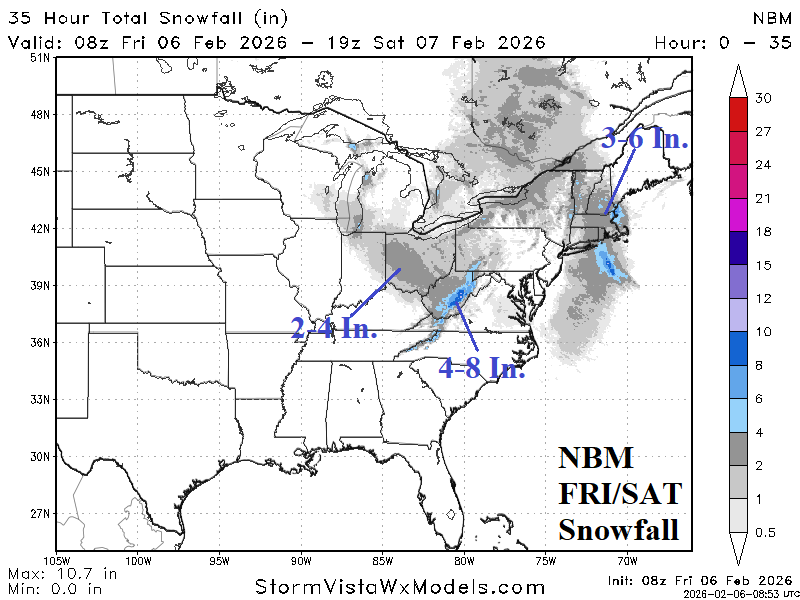 Fig. 2: NBM snowfall forecast for the next 48 hours across the East U.S.