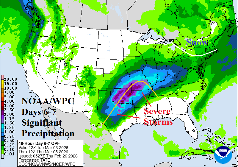 Operational discussion: Wet weather moves across the Southeast U.S. and Florida the next 2-3 days. The next storm system may bring moderate snows from Omaha to near St. Louis to Morgantown and northward on Sunday reaching the northern Mid-Atlantic States on Monday (Fig. 1). By mid-next week, heavy rain and possible severe weather will develop across Texas to Missouri (Fig. 2). Once the Texas to Missouri rainfall is established middle of next week, MJO influence maintains the heavy rain pattern throughout the 8-14-day period (Fig. 3). Included with that rainfall are additional severe storms. U.S. gas population weight HDD forecasts through the first third of March continue to surge much warmer.