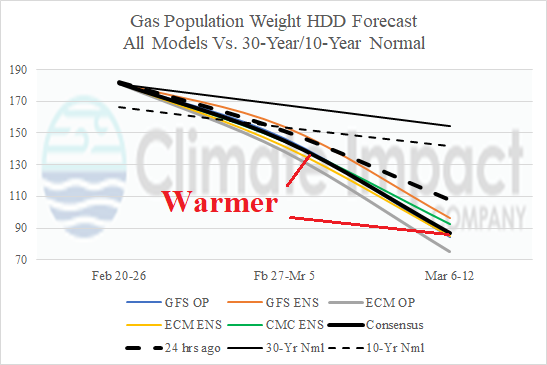 Fig. 4: The U.S. gas population weight HDD forecast utilizing all operational models, their consensus, and comparison with 24 hours ago and 30/10-year normal.