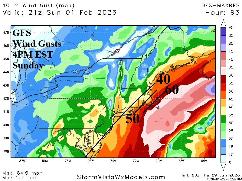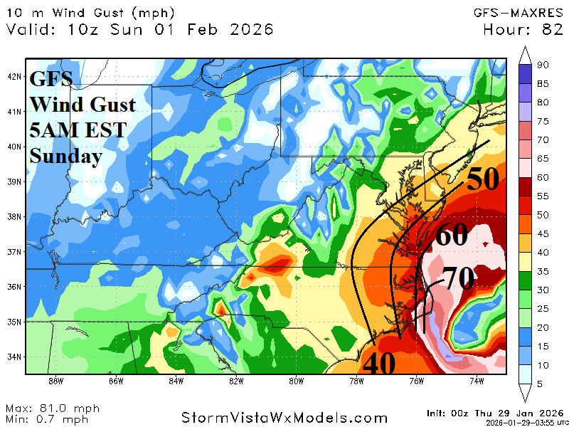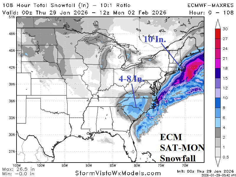 The weekend East Coast storm appears powerful, as indicated by both GFS and ECM, except far enough offshore to prevent a major snowfall for the Northeast Corridor with some exceptions. Duration of storm, as the event develops, causes 4-8 inches of snow across the Carolinas (away from the coast) Friday night into Sunday morning according to ECM (Fig. 2). Some locally heavy snow is possible across northeastern North Carolina and possibly the Norfolk, VA area. Snowfall amounts are cutback across Virginia. The northern Mid-Atlantic misses the snow although coastal areas are likely snowy. Southeast Massachusetts remains targeted for >10 inches of snow with a likely sleet mix for Cape Cod. A larger concern is the wind. Due to unusually low pressure, this storm will produce hurricane force gusts on the North Carolina Coast with gusts to 50 mph across interior eastern Virginia and North Carolina (Fig. 3). Wind gusts of 50-65 mph are likely across southeast Massachusetts (Fig. 4). The increased marine influence on the air mass in Southeast Massachusetts causes heavy sleet.
