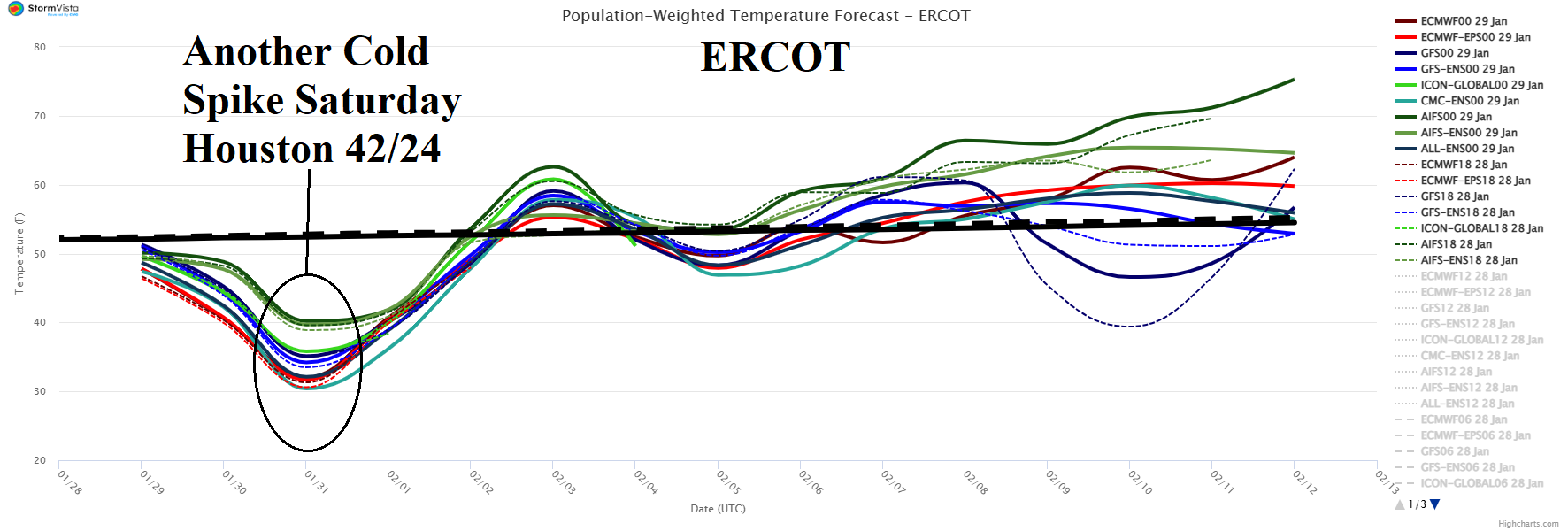 Another wave of cold air follows the storm. Briefly, chilly air reaches ERCOT as Houston plummets to 24 Saturday night (Fig. 5). Deep cold rolls across SERC as Atlanta chills at 29/15 Saturday and 33/21 Sunday (Fig. 6).