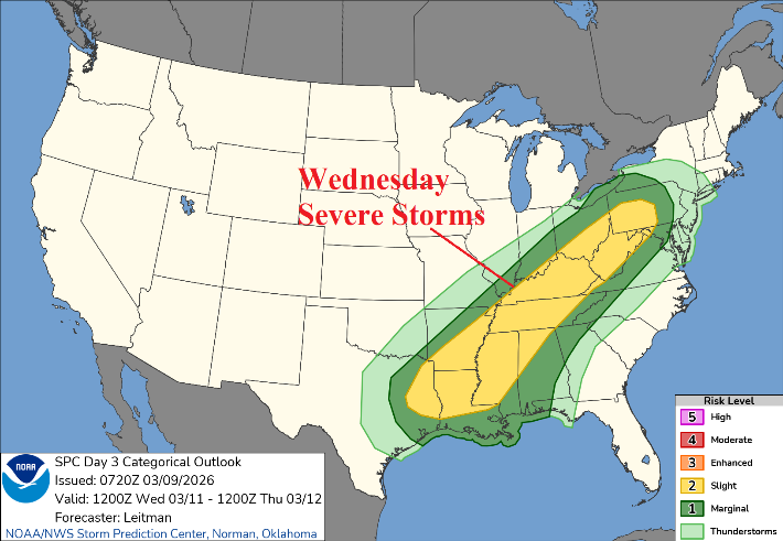 Fig. 7-9: NOAA severe weather outlook for tomorrow and attendant flooding rainfall risk areas plus Wednesday’s severe weather outlook.