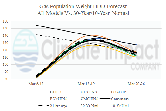 The U.S. population weight HDD forecast continues show low heating demand (nationally) this week recovering to near normal mid-to-late March as the Northeast is exposed to some colder air (Fig. 10).