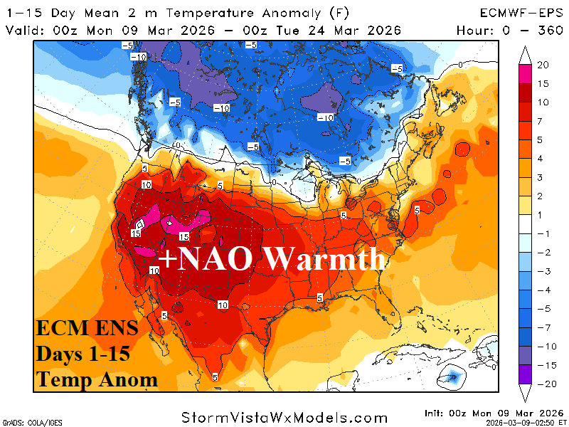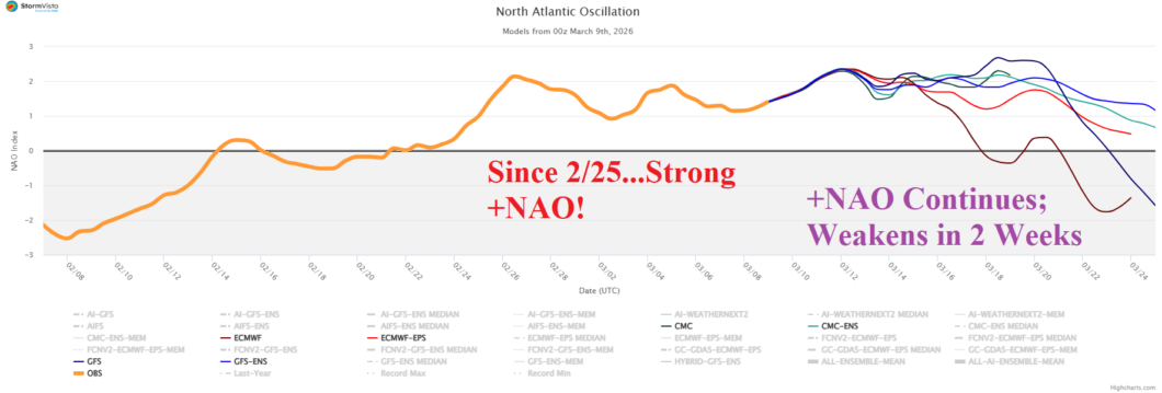 Highlight: -PNA/+NAO influences on U.S. climate; Severe weather early-to-middle week.