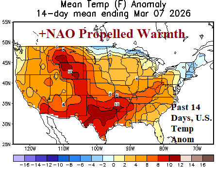 Discussion: Vigorous positive phase of the North Atlantic oscillation (Fig. 1) is the lead climate signal supporting the warm pattern across the U.S. during the past 14 days (Fig. 2). Although Canada is cold and some of the chill may affect the northeast quadrant of the U.S. in the medium range, the overall U.S. temperature scenario is warm (Fig. 3). The negative phase of the Pacific North America (-PNA) has dominated in recent weeks (Fig. 4) although under-performing as a wet/snowy weather maker in the Northwest/West U.S. while the attendant dry signal for the Southeast is strong (Fig. 5). Significant precipitation is forecast this week in the Northwest and East-central/Mid-south U.S. as -PNA strengthens. The -PNA pattern weakens next week, and a much drier pattern follows. Note the over-forecasting nature of forecast models in the Northwest and Southeast during the past 14 days (Fig. 6).