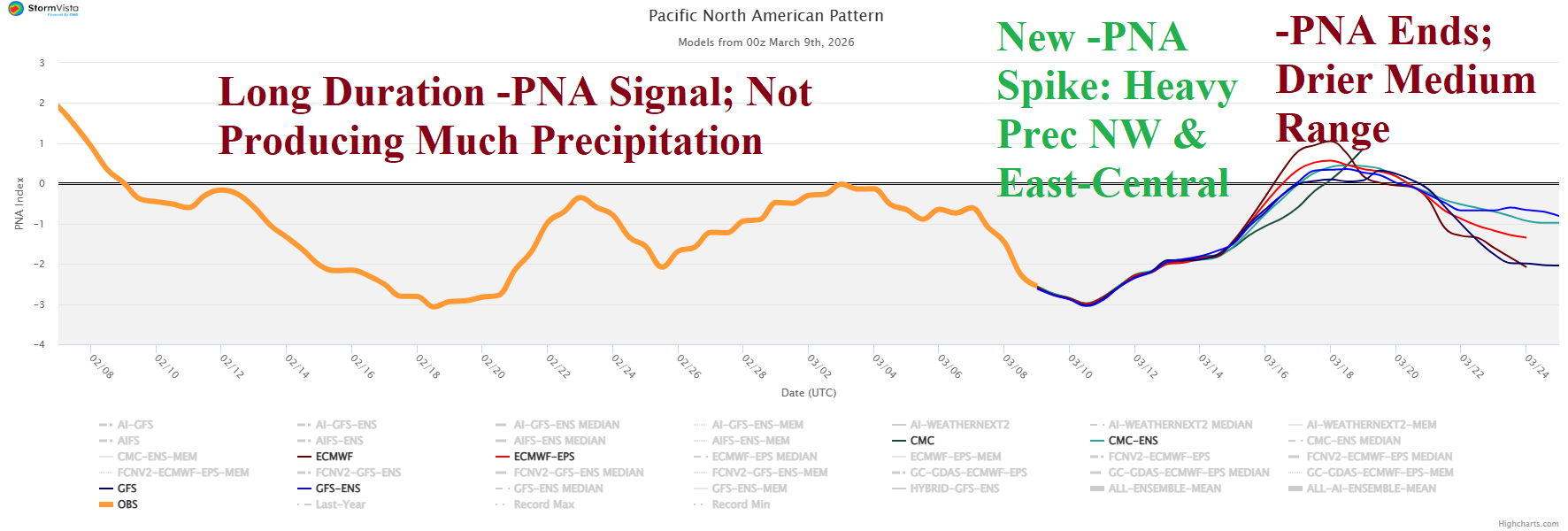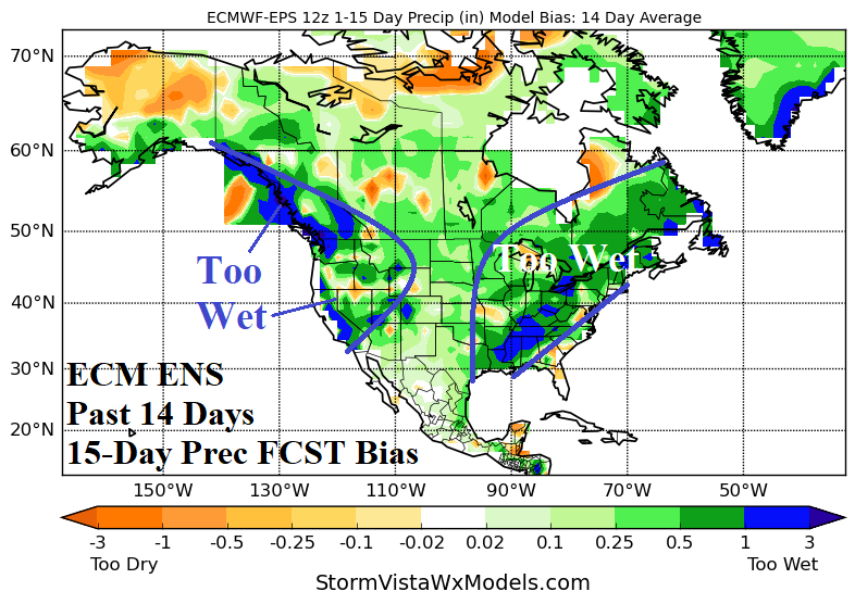 Fig. 4-6: Negative Pacific North America index is a wet Northwest/dry Southeast (U.S.) climate signal most effective in the Southeast in recent weeks. Forecast models are over-forecasting precipitation in the Northwest and East of late.