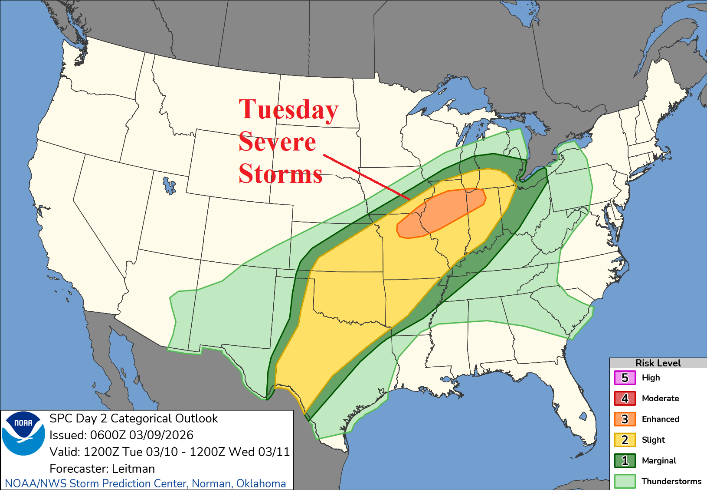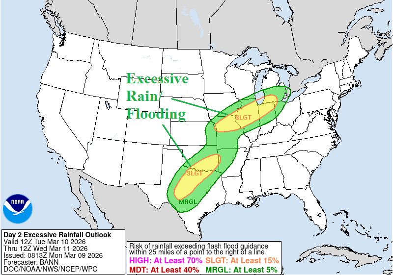 NOAA/SPC projects an expansive severe weather outbreak tomorrow from Texas to the southern Great Lakes region (Fig. 7). The highest risk of tornadoes is across North-central Illinois. Excessive rainfall causing flooding is most likely in West-central Texas and Missouri to Indiana (Fig. 8). On Wednesday, severe storms arc from the northwest Gulf States to Pennsylvania (Fig. 9) and are likely to include tornado risk.