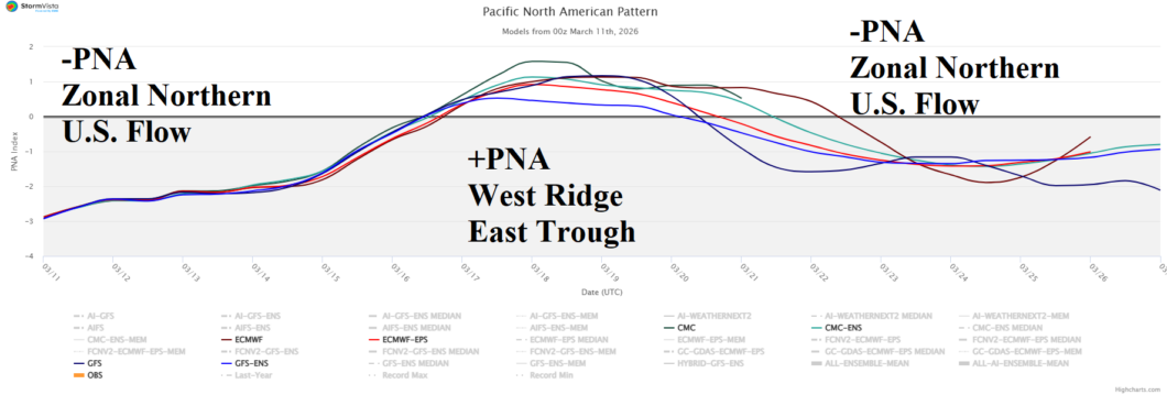 Highlight: -PNA pattern rules; Big heat Southwest next week, cold pulse East.