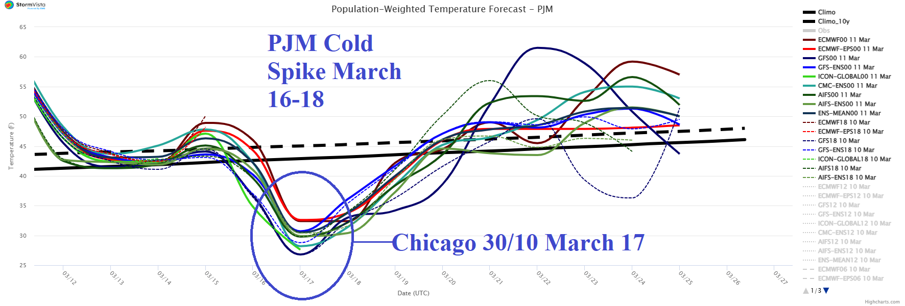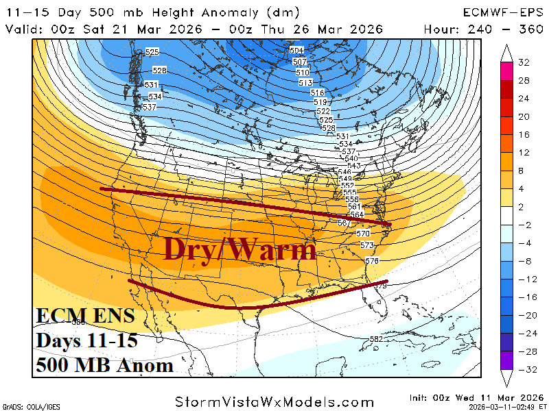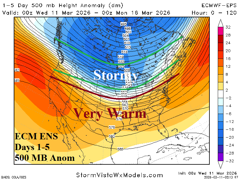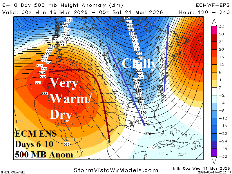 Enough buckling in the upper air pattern remains in the forecast to deliver a late winter chill to PJM (Fig. 5) centered on March 16-18 when Chicago cold peak is 30/10 (March 17th). The cold peak is 3-5F less cold than forecast earlier this week.