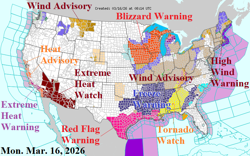 Fig. 1: Latest NOAA/NWS weather watch, warning, and advisory areas.