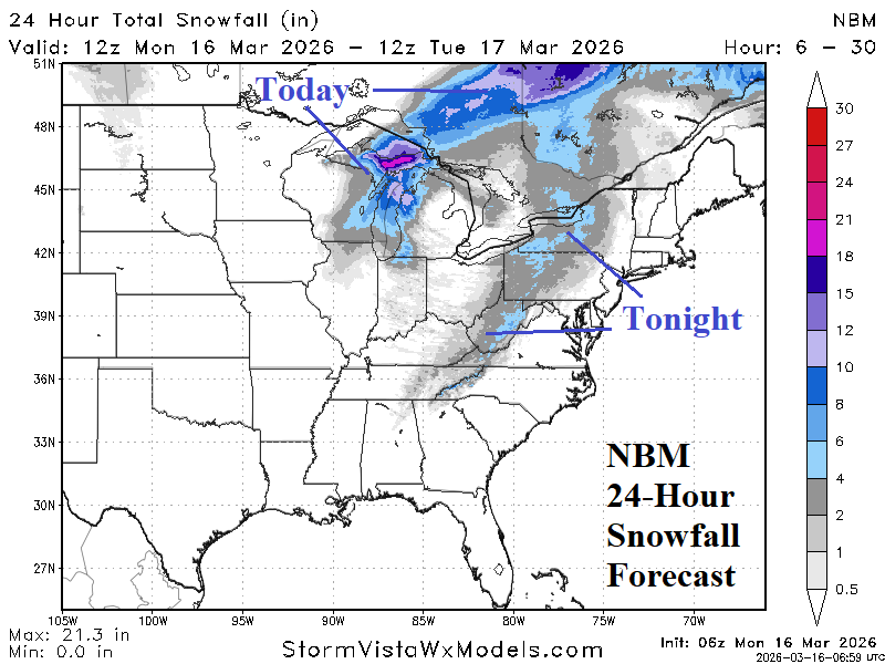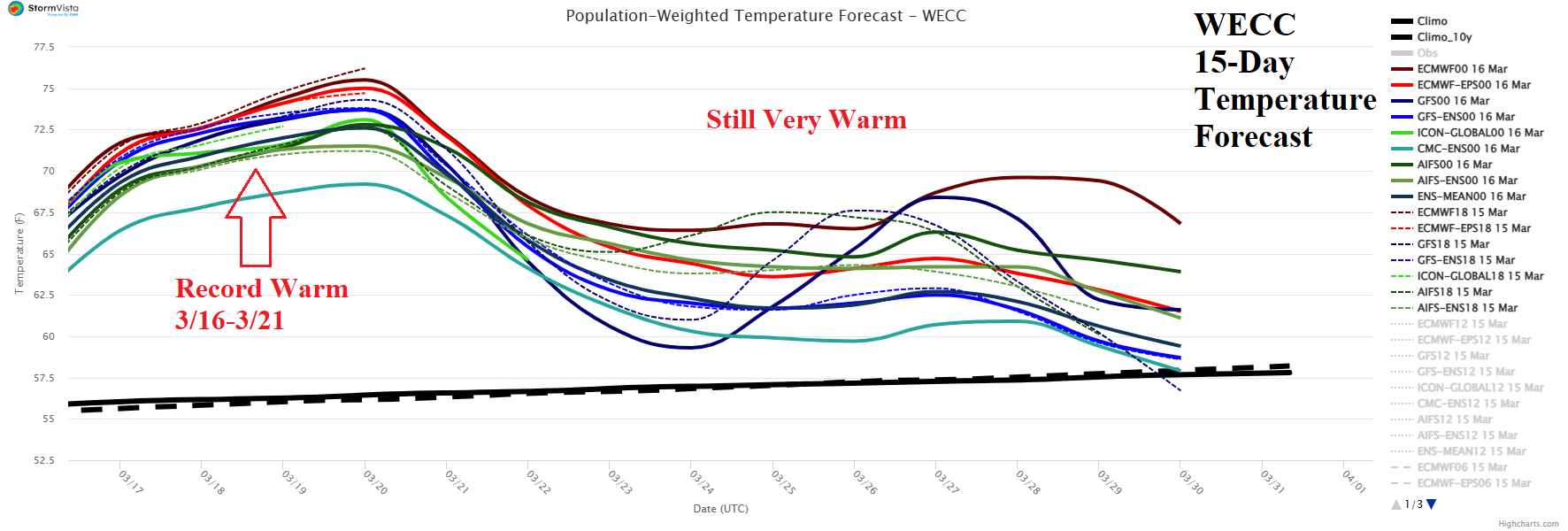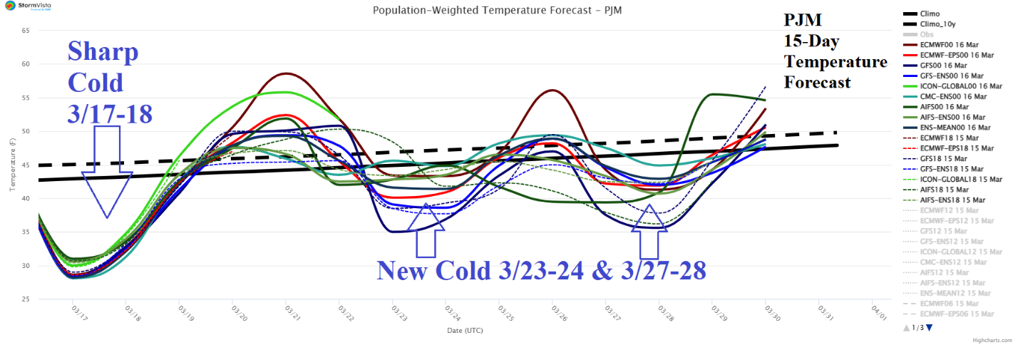 Discussion: A squall line has (temporarily) lost severe weather qualifiers moving east across the east/southeast Ohio Valley this morning while the southern end of the squall line maintains tornado risk for Mississippi and Alabama (Fig. 1). Later today, the squall line re-energizes and brings severe storms including a large tornado risk area to the East (Fig. 2-3). The Midwest Blizzard winds down later today after another 5-15 in. of snow (Fig. 4). Snow will follow tonight’s cold front into the central and northern Appalachian Mountains. High wind advisories are widespread with this East U.S. storm. A High Wind Warning is issued for southeast New England. HRRR indicates wind gust potential of 60-70 mph across the southern half of New England tonight causing another round of power outages (Fig. 5). Following the storm, the energy demand PJM region receives a late season cold blast braking for milder weather later this week (Fig. 6). Interestingly, the PJM 15-day forecast indicates 2 additional chilly bursts. Meanwhile record heat dominates the West (Fig. 7). An Excessive Heat Watch is issued for the Southwest U.S. and Excessive Heat Warnings are already issued for the Los Angeles area. The U.S. population weight HDD forecast shifts slightly cooler for next week and the following week except for a renegade warm ECM forecast (Fig. 8).