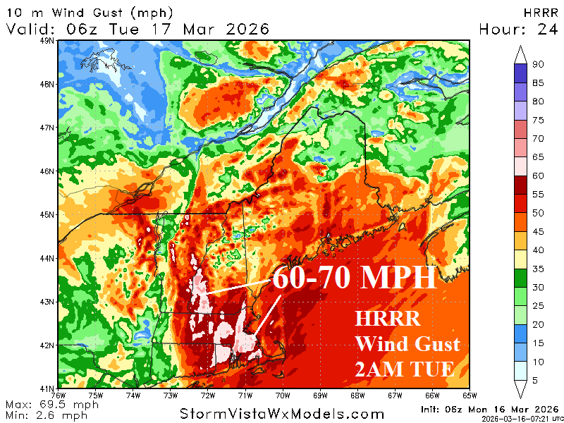 Fig. 4-5: NBM 24-hour snowfall forecast and HRRR wind gust forecast for tonight in New England.