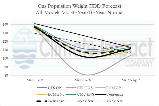 Fig. 8: The U.S. gas population weight HDD forecast utilizing all operational models, their consensus, and comparison with 24 hours ago and 30/10-year normal.