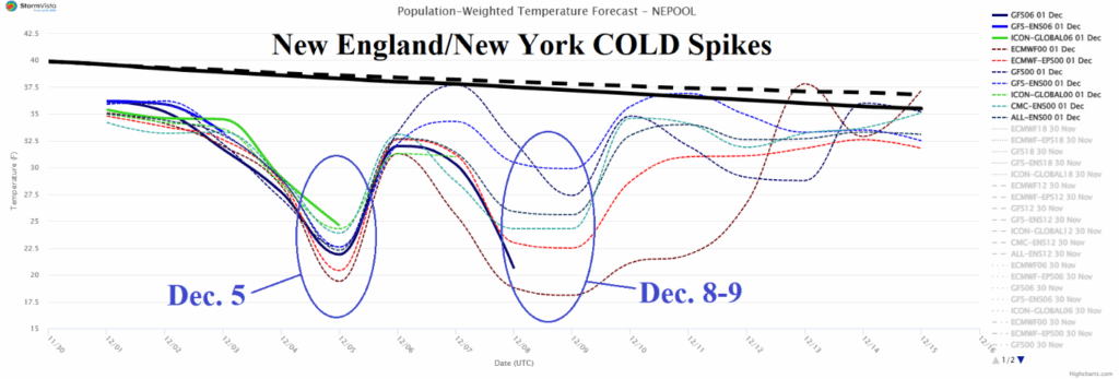 Discussion: Winter Storm Watch (Fig. 1) for 5-10 inches of snow (Fig. 2) is posted for tomorrow stretching from Northeast Pennsylvania through central New England to Downeast Maine. Winter Weather Advisories are issued for 2-4 inches of snow today from Kansas to Pennsylvania with sleet and ice as far south as Arkansas. More significant snow is possible in the Mid-Atlantic region away from the coast on Friday (Fig. 3). An exceptionally cold start to meteorological winter 2025-26 in the East with a frigid 15-day forecast for New England/New York (Fig. 4) including 2 cold spikes (Dec. 5 and Dec. 8-9) and a long stretch of cold for the PJM Sector although some moderation in the extended range (Fig. 5). The brutal cold in the East follows a month of November when much of the U.S. was milder than normal (Fig. 6) and quite dry in the East (Fig. 7). However, late month snow caused the continental snow cover to expand above normal (Fig. 8) and is the catalyst for a cold first half of December in the East (Fig. 9).